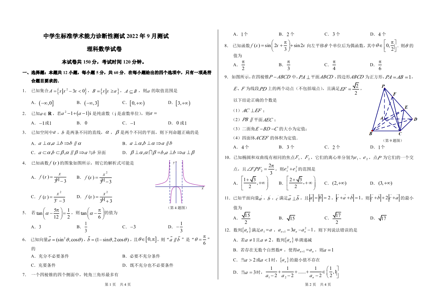 高三理科数学--2022年9月中学生标准学术能力诊断性测试测试