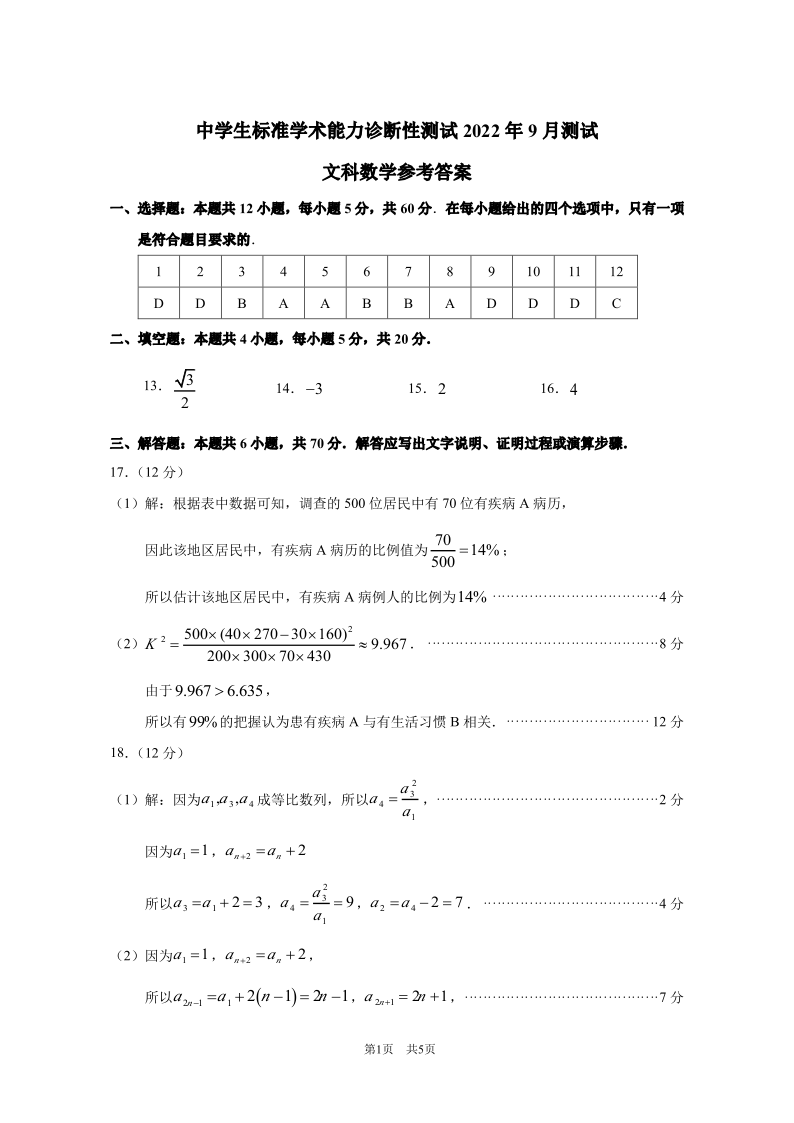 高三文科数学答案----2022年9月中学生标准学术能力诊断性测试测试