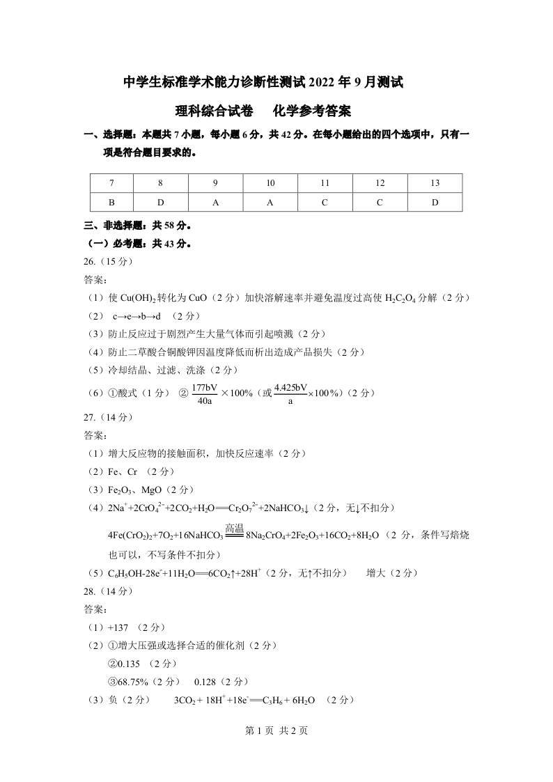 高三理综化学答案----2022年9月中学生标准学术能力诊断性测试测试
