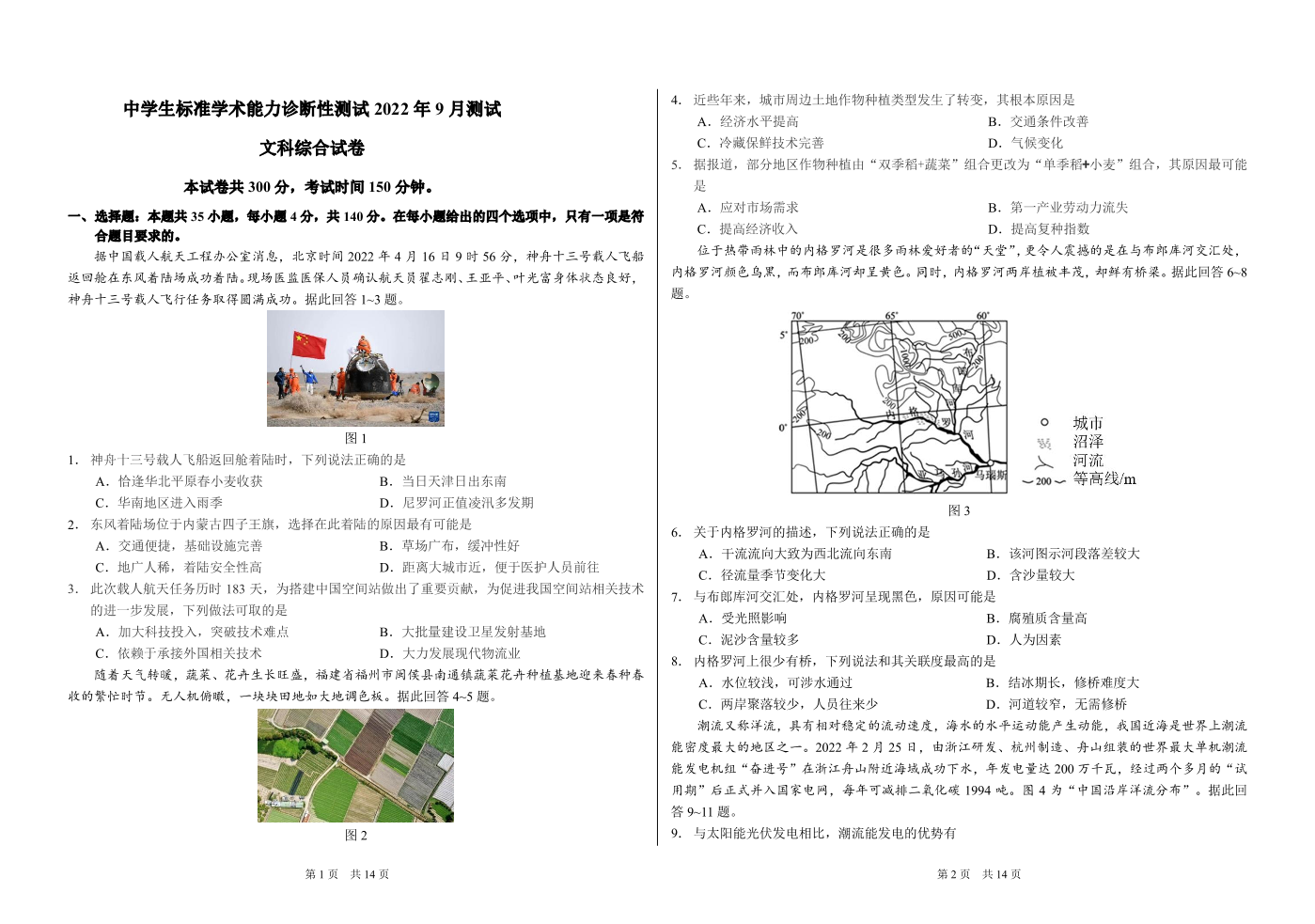 高三文综----2022年9月中学生标准学术能力诊断性测试测试