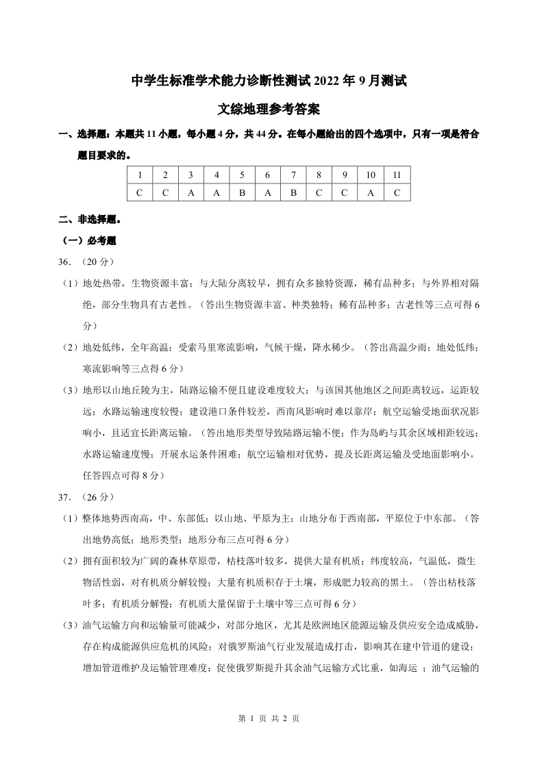 高三文综地理答案----2022年9月中学生标准学术能力诊断性测试测试