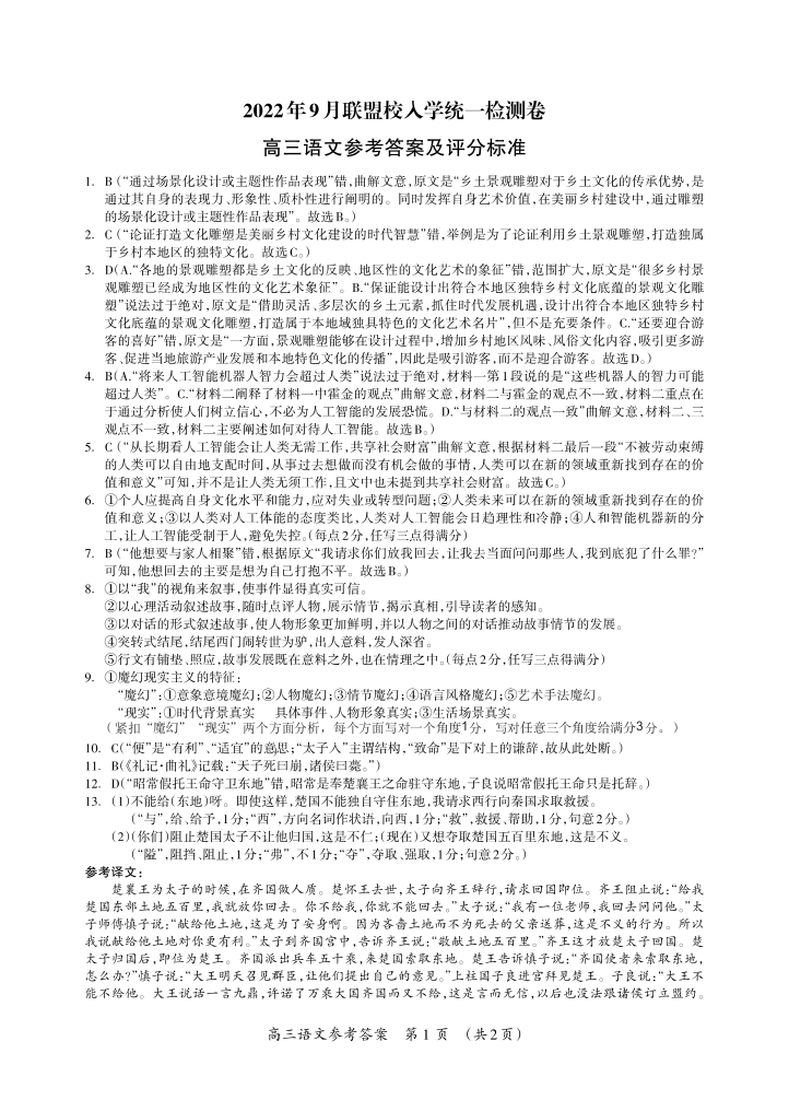 高三语文答案--广西桂林联盟校2023届高三9月入学统一检测