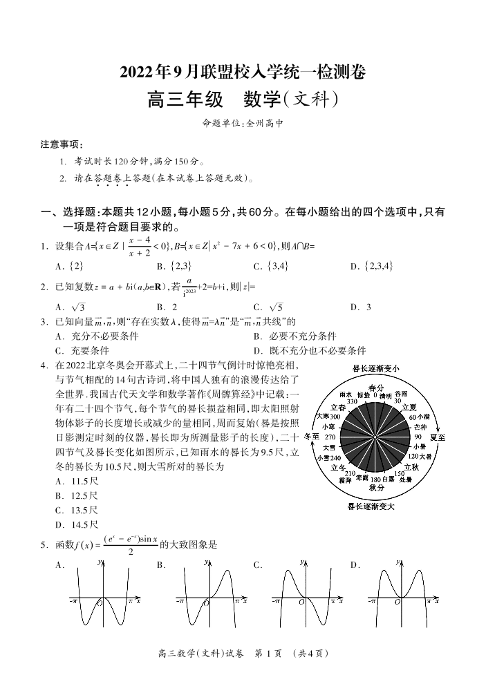 高三文科数学--广西桂林联盟校2023届高三9月入学统一检测