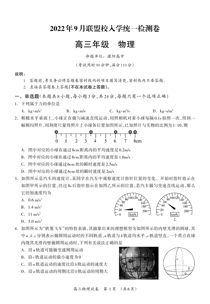 高三物理--广西桂林联盟校2023届高三9月入学统一检测