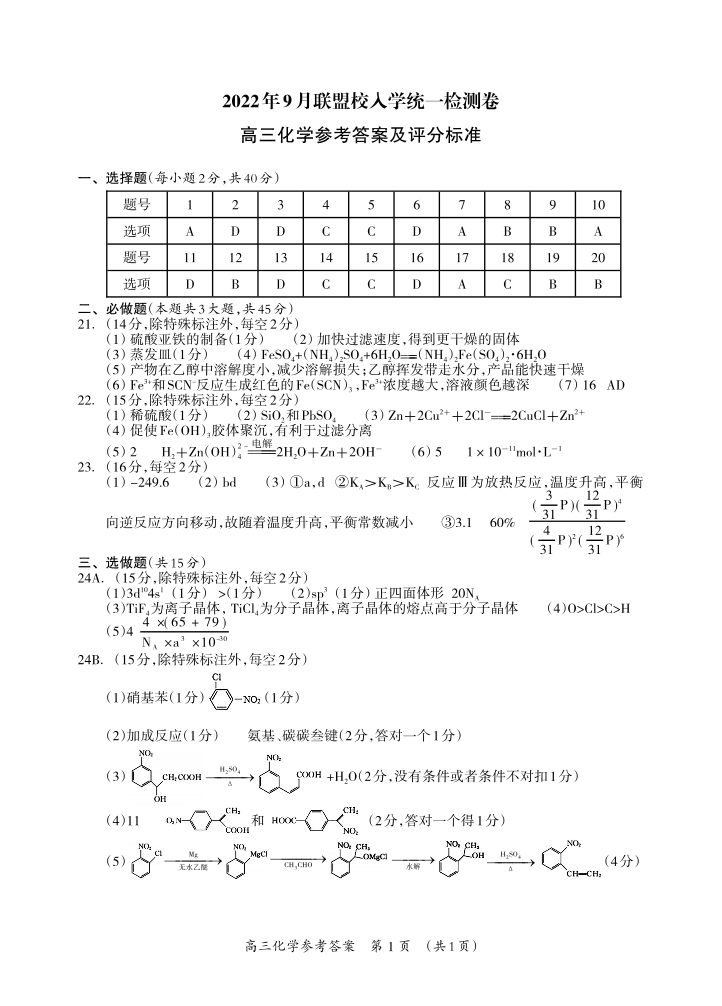 高三化学答案--广西桂林联盟校2023届高三9月入学统一检测