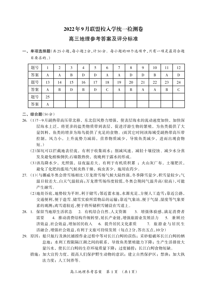 高三地理答案--广西桂林联盟校2023届高三9月入学统一检测
