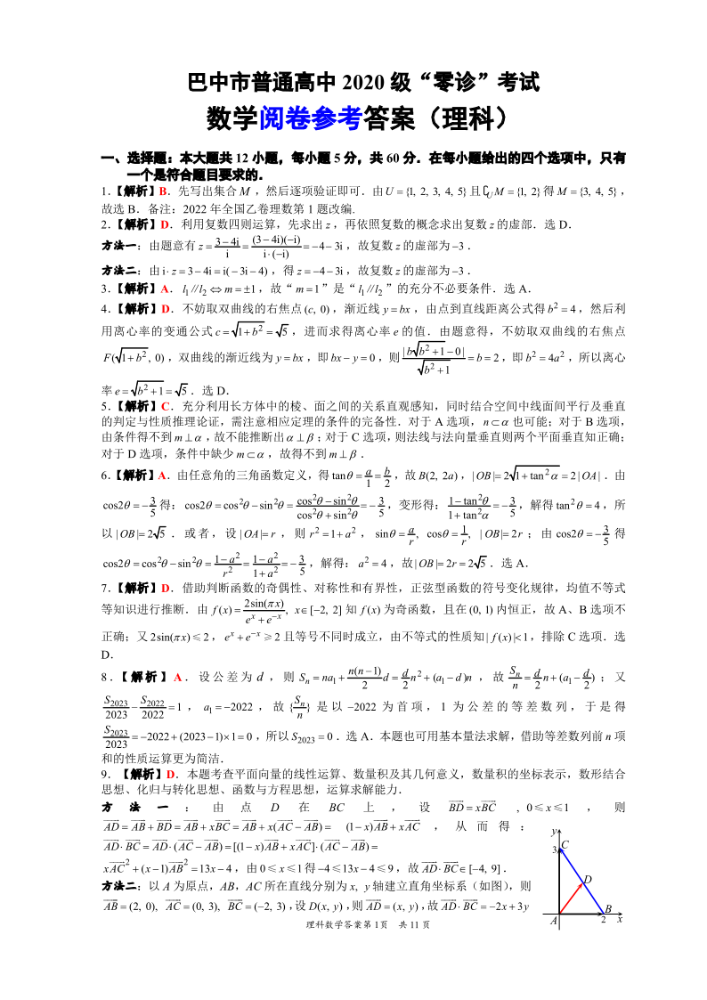 高三理数答案--四川省巴中市2023届高三零诊