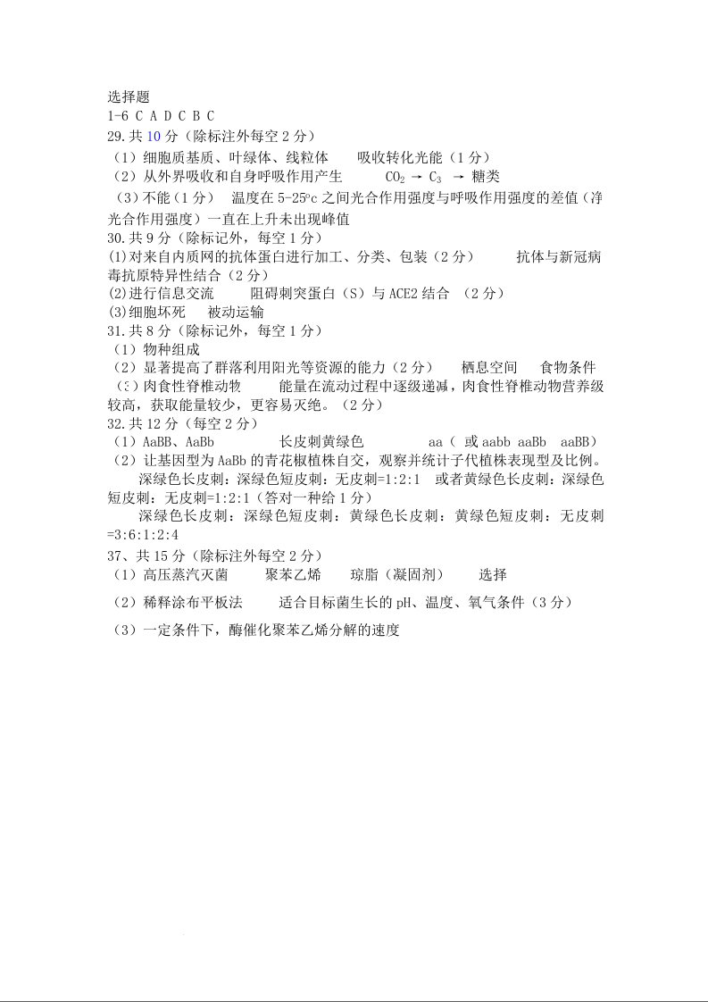 高三理综生物答案--四川省巴中市2023届高三零诊