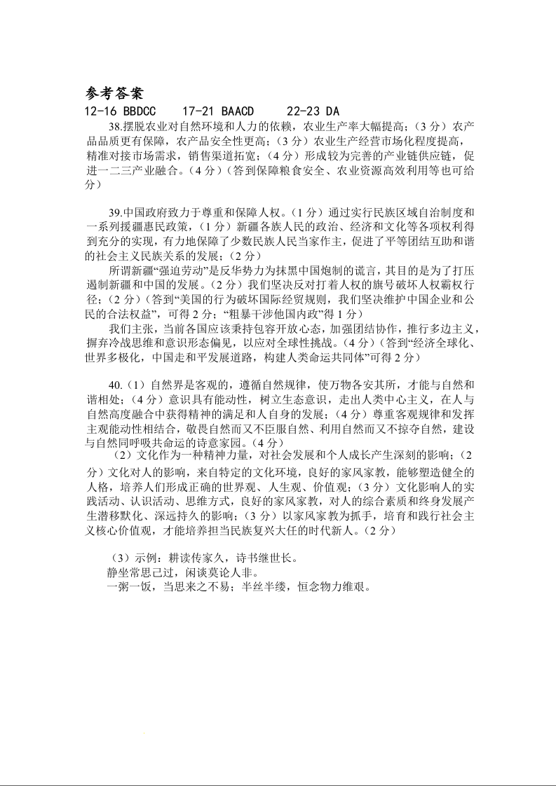 高三文综政治答案--四川省巴中市2023届高三零诊