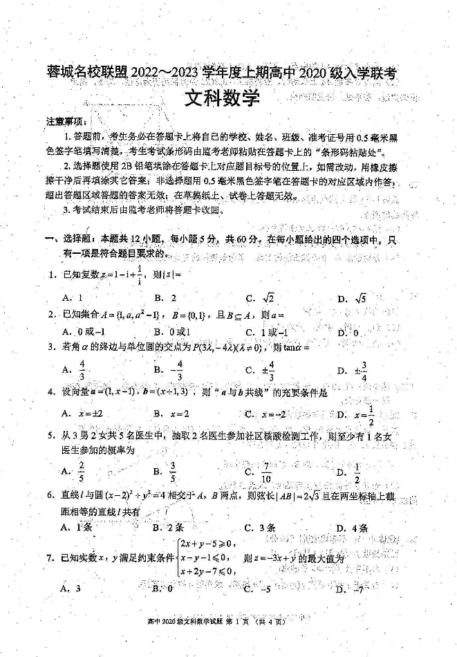 高三文科数学--四川省蓉城名校联盟23届高三上学期入学联考