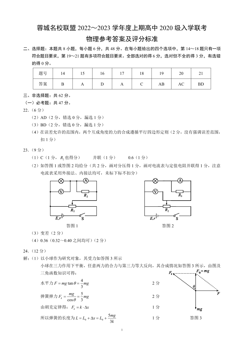 高三理综物理答案--四川省蓉城名校联盟23届高三上学期入学联考