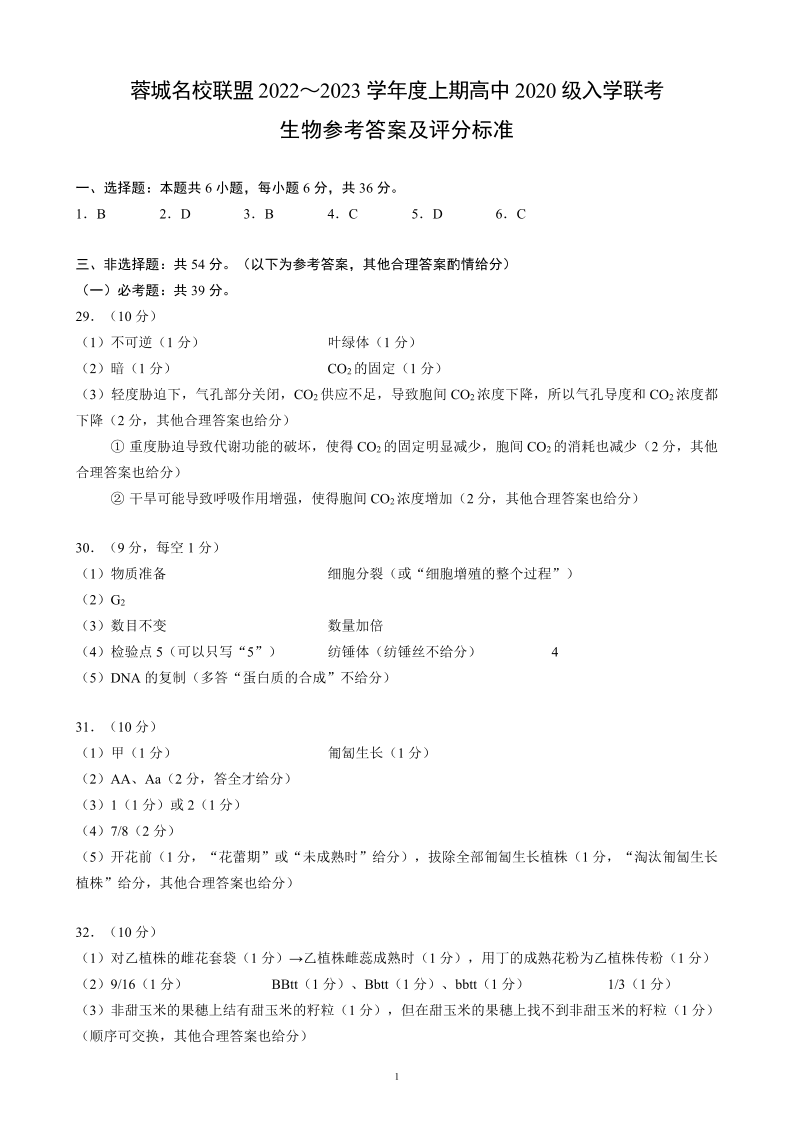 高三理综生物答案--四川省蓉城名校联盟23届高三上学期入学联考