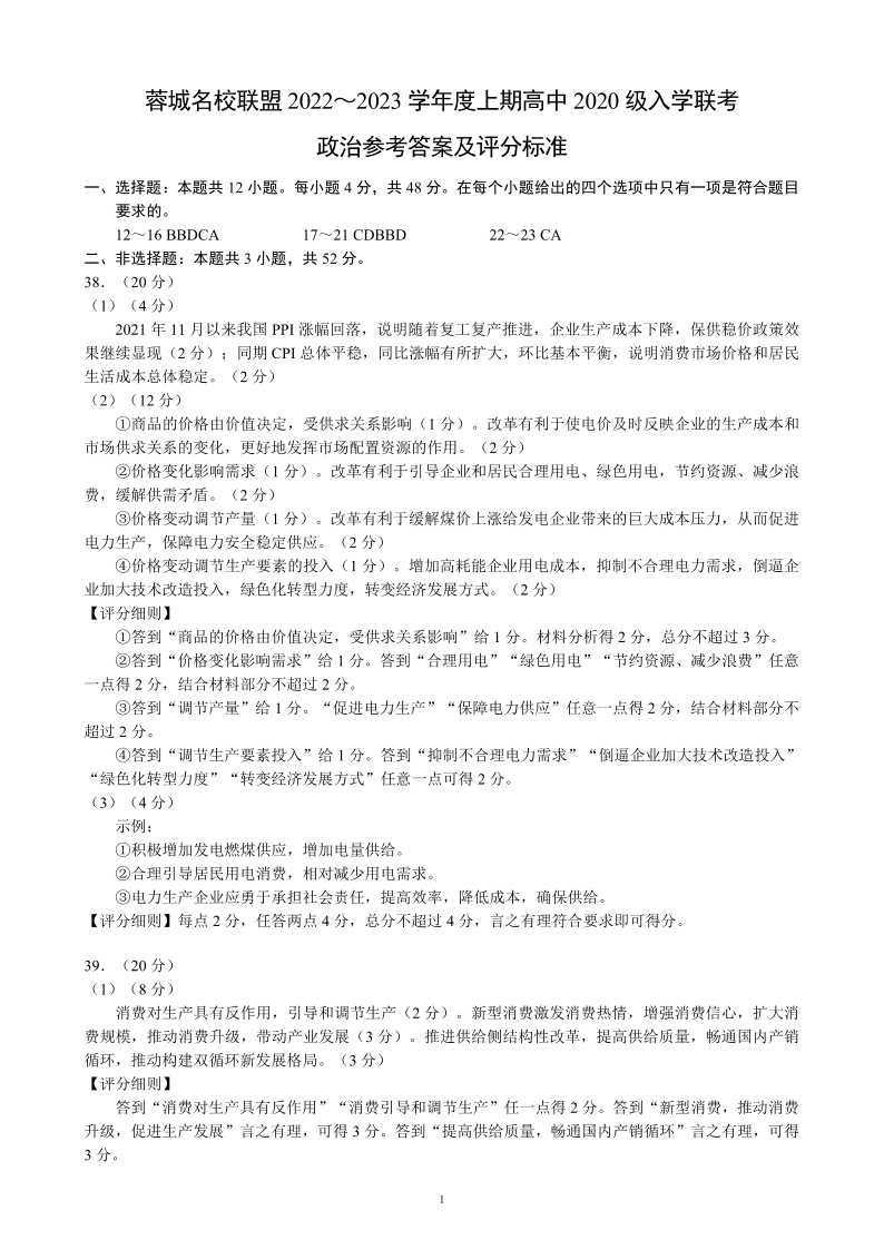 高三文综政治答案--四川省蓉城名校联盟23届高三上学期入学联考