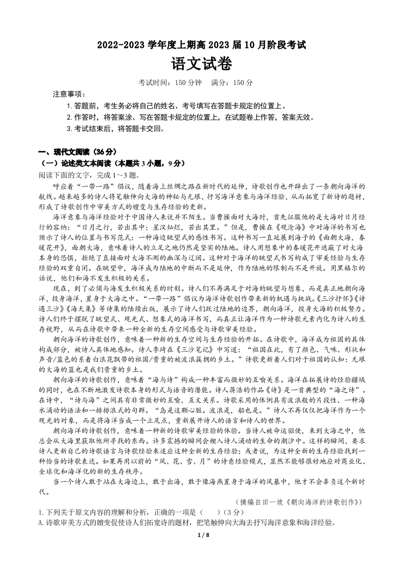 高三语文--四川省成都市第七中学2023届高三上学期10月阶段考试