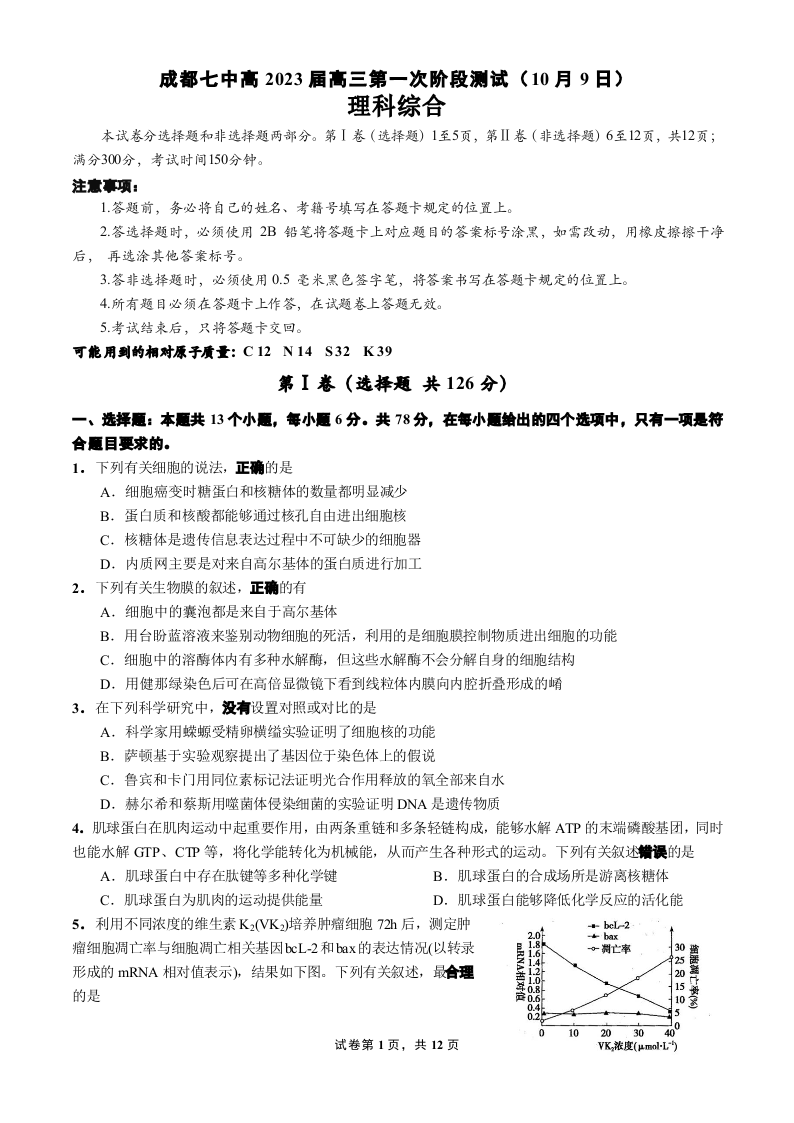 高三理综--四川省成都市第七中学2023届高三上学期10月阶段考试