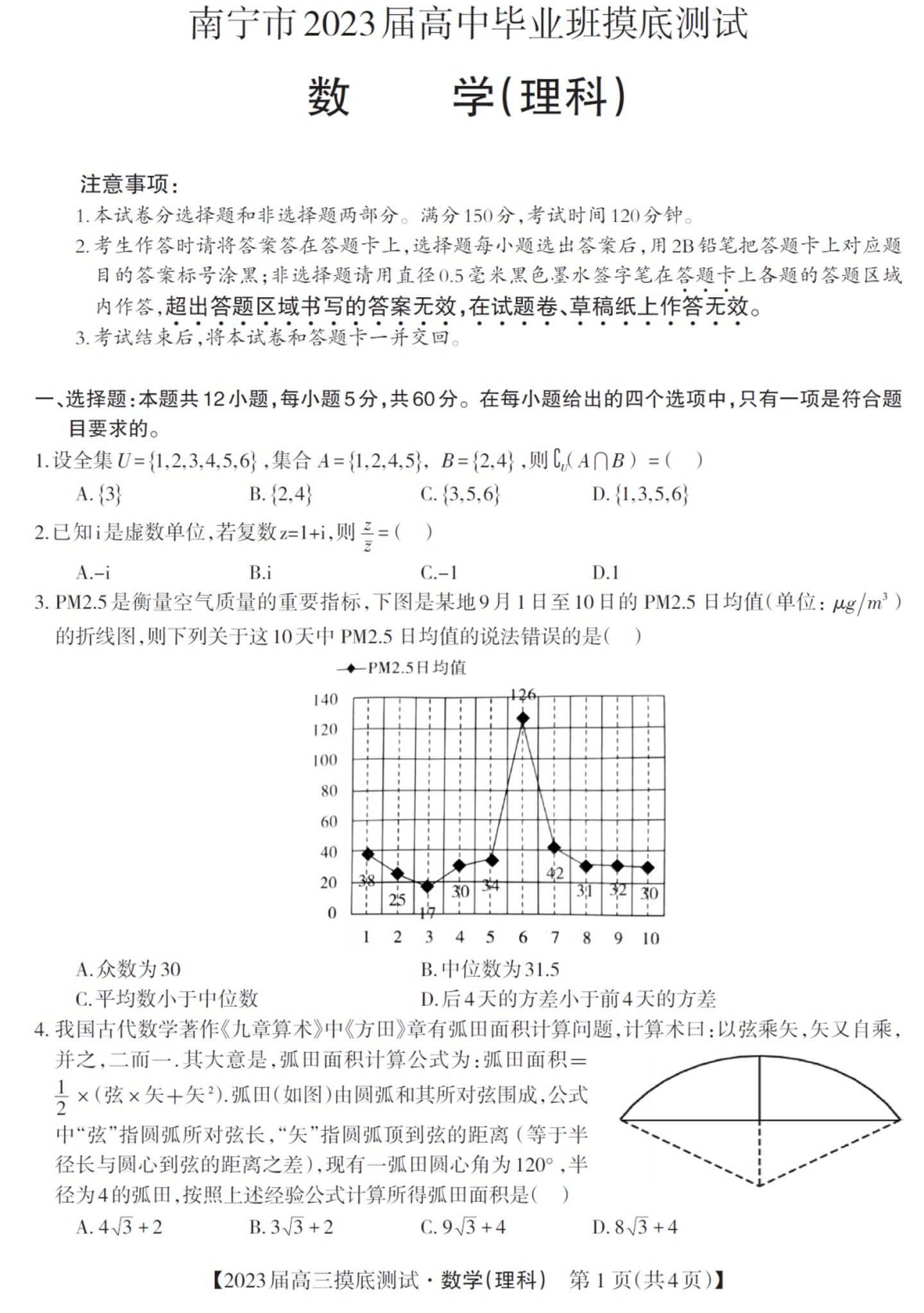 高三理数--广西南宁市2023届高三上学期毕业班摸底测试