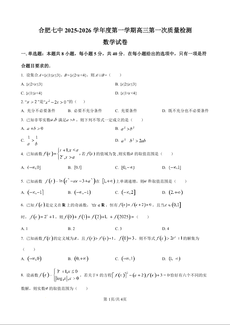 高三数学(原卷版)--安徽省合肥市第七中学2026届高三上学期第一次质量检测