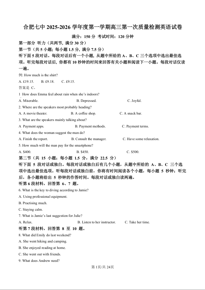 高三英语(精品解析版)--安徽省合肥市第七中学2026届高三上学期第一次质量检测