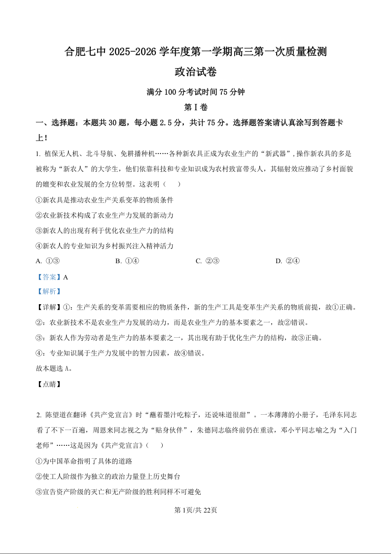 高三政治(精品解析版)--安徽省合肥市第七中学2026届高三上学期第一次质量检测