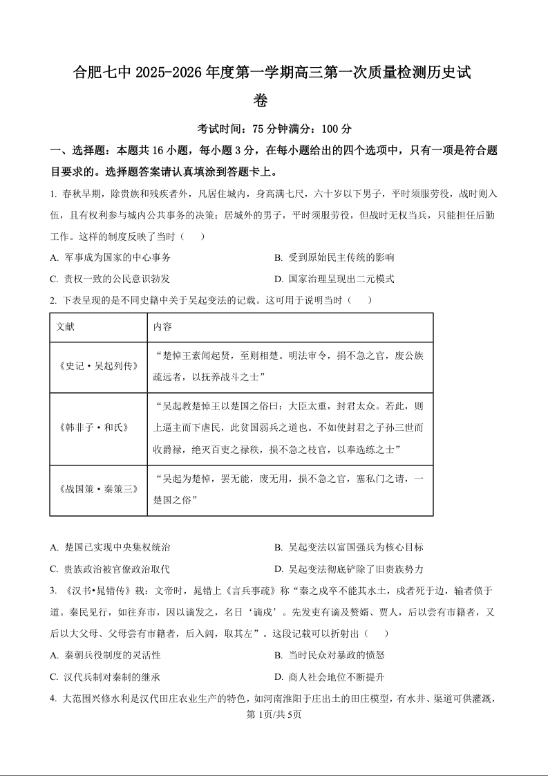 高三历史(原卷版)--安徽省合肥市第七中学2026届高三上学期第一次质量检测