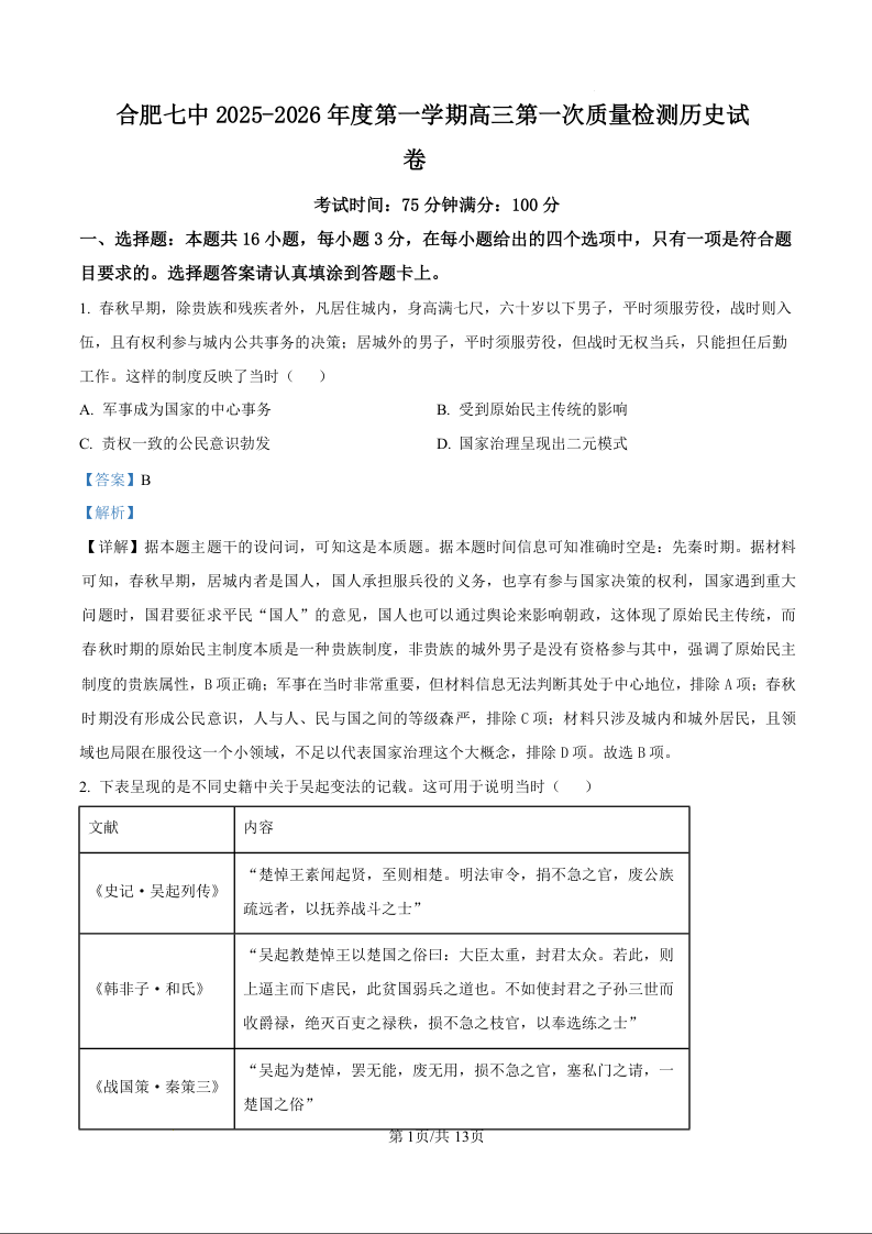 高三历史(精品解析版)--安徽省合肥市第七中学2026届高三上学期第一次质量检测