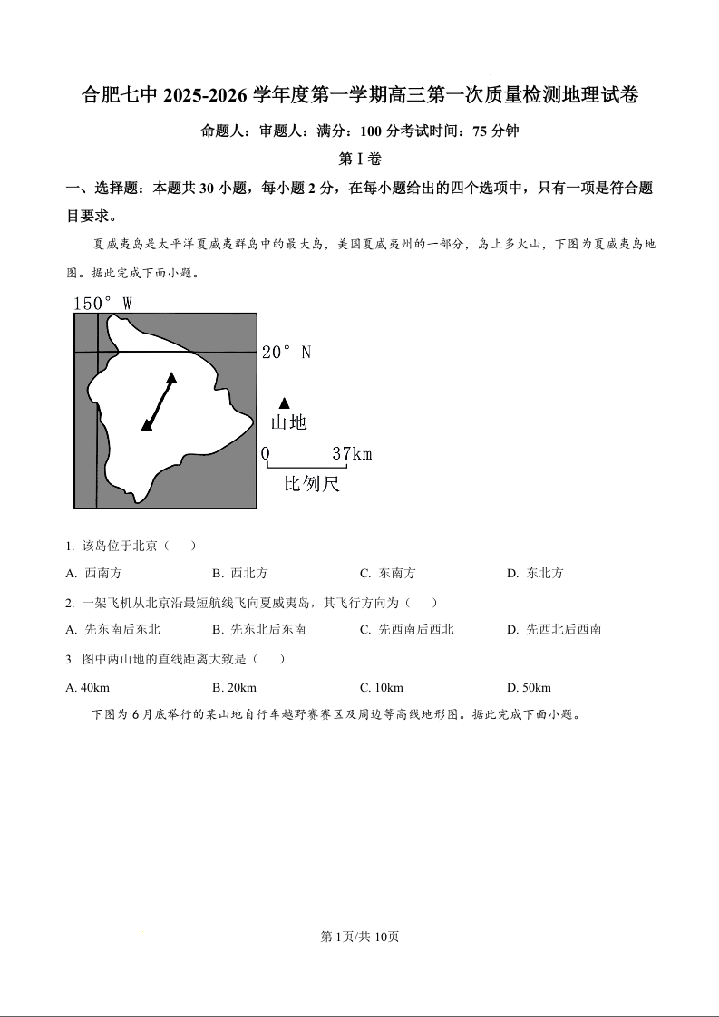 高三地理(原卷版)--安徽省合肥市第七中学2026届高三上学期第一次质量检测