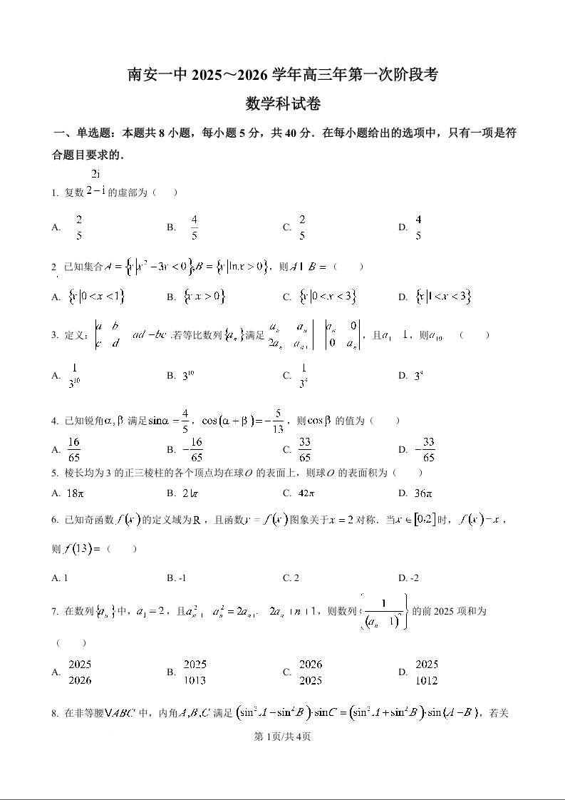 高三数学(原卷版)--福建省泉州市南安第一中学2026届高三上学期第一次段考