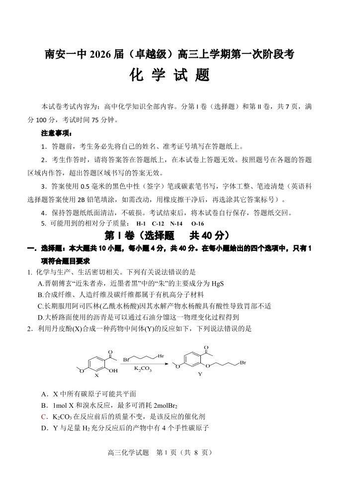 高三化学--福建省泉州市南安第一中学2026届高三上学期第一次段考