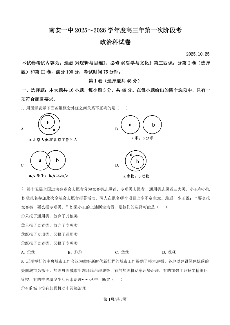 高三政治(原卷版)--福建省泉州市南安第一中学2026届高三上学期第一次段考