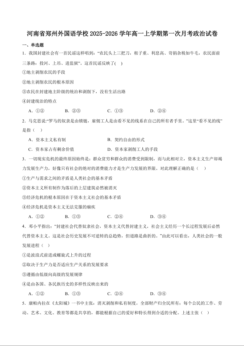 高一政治+答案--河南省郑州外国语学校2025-2026学年高一上学期10月月考试题