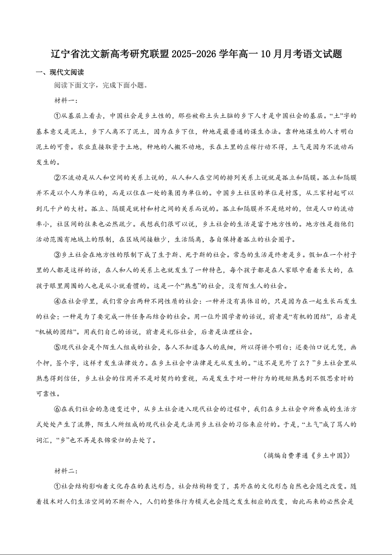 高一语文+答案--辽宁省沈文新高考研究联盟2025-2026学年高一上学期10月质量监测