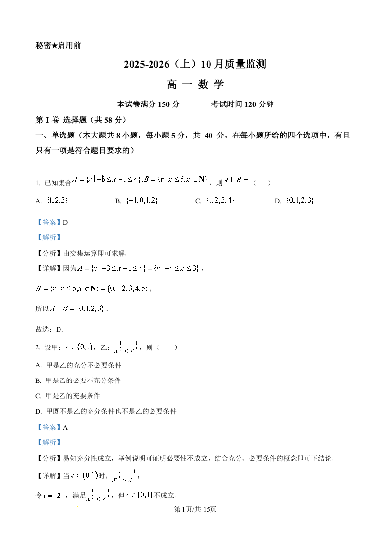 高一数学(精品解析版)--辽宁省沈文新高考研究联盟2025-2026学年高一上学期10月质量监测
