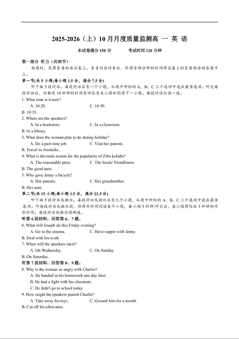 高一英语+答案--辽宁省沈文新高考研究联盟2025-2026学年高一上学期10月质量监测