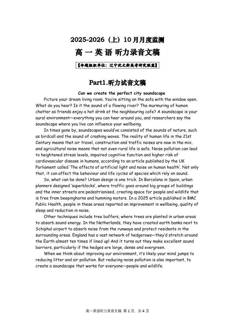 高一英语听力原文--辽宁省沈文新高考研究联盟2025-2026学年高一上学期10月质量监测