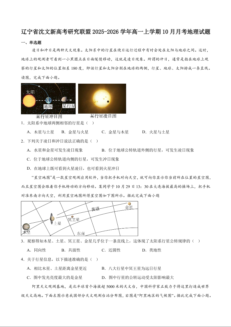 高一地理+答案--辽宁省沈文新高考研究联盟2025-2026学年高一上学期10月质量监测