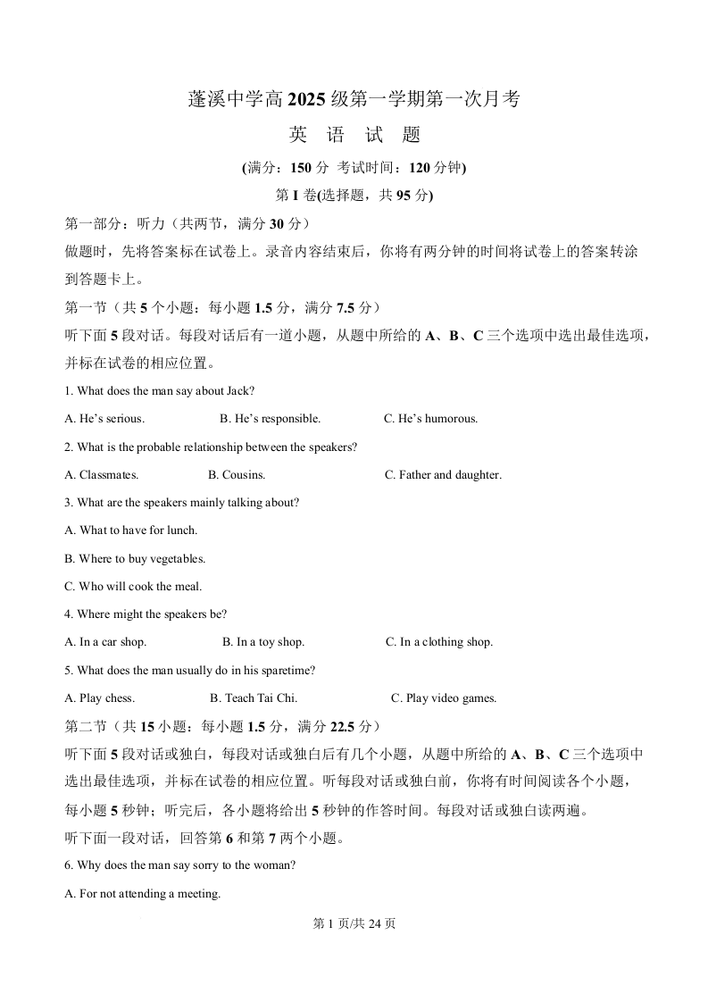 高一英语(解析版)--四川省遂宁市蓬溪中学2025-2026学年高一上学期10月月考