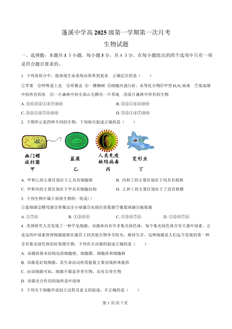 高一生物(原卷版)--四川省遂宁市蓬溪中学2025-2026学年高一上学期10月月考
