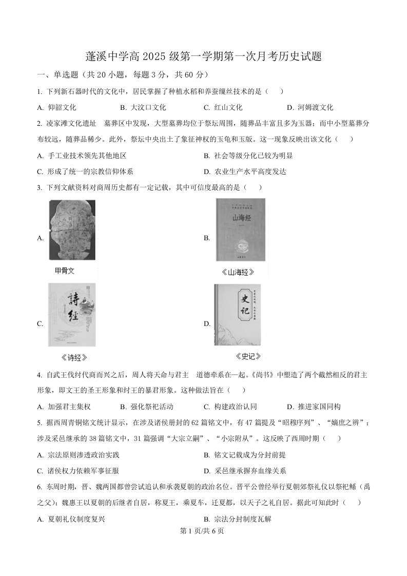 高一历史(原卷版)--四川省遂宁市蓬溪中学2025-2026学年高一上学期10月月考