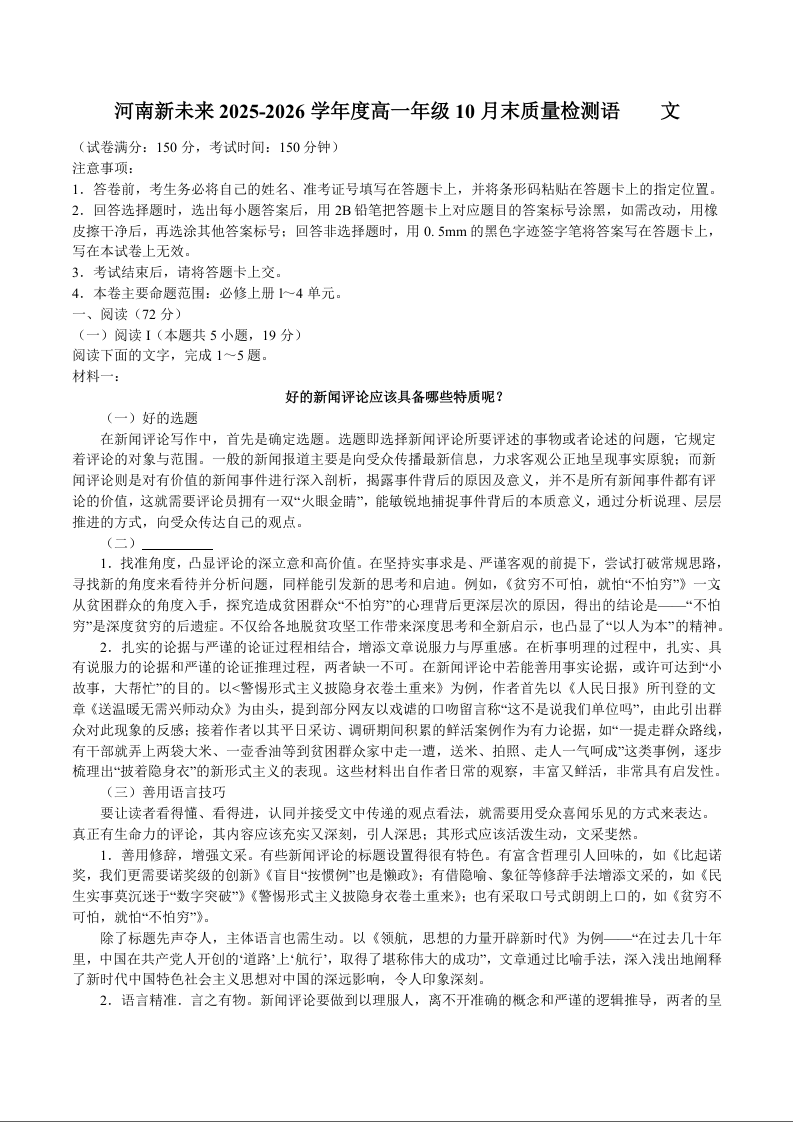 高一语文+答案--河南省新未来大联考2025-2026学年高一上学期10月末质量检测