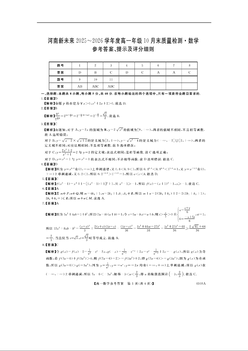 高一数学答案--河南省新未来大联考2025-2026学年高一上学期10月末质量检测