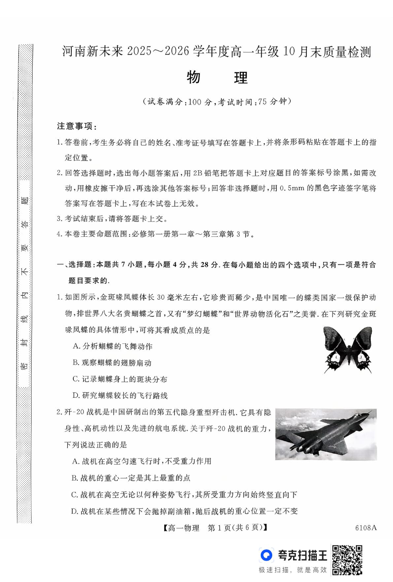 高一物理--河南省新未来大联考2025-2026学年高一上学期10月末质量检测