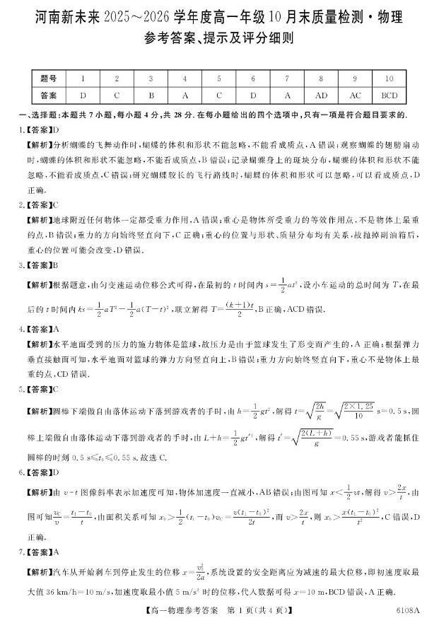 高一物理答案--河南省新未来大联考2025-2026学年高一上学期10月末质量检测