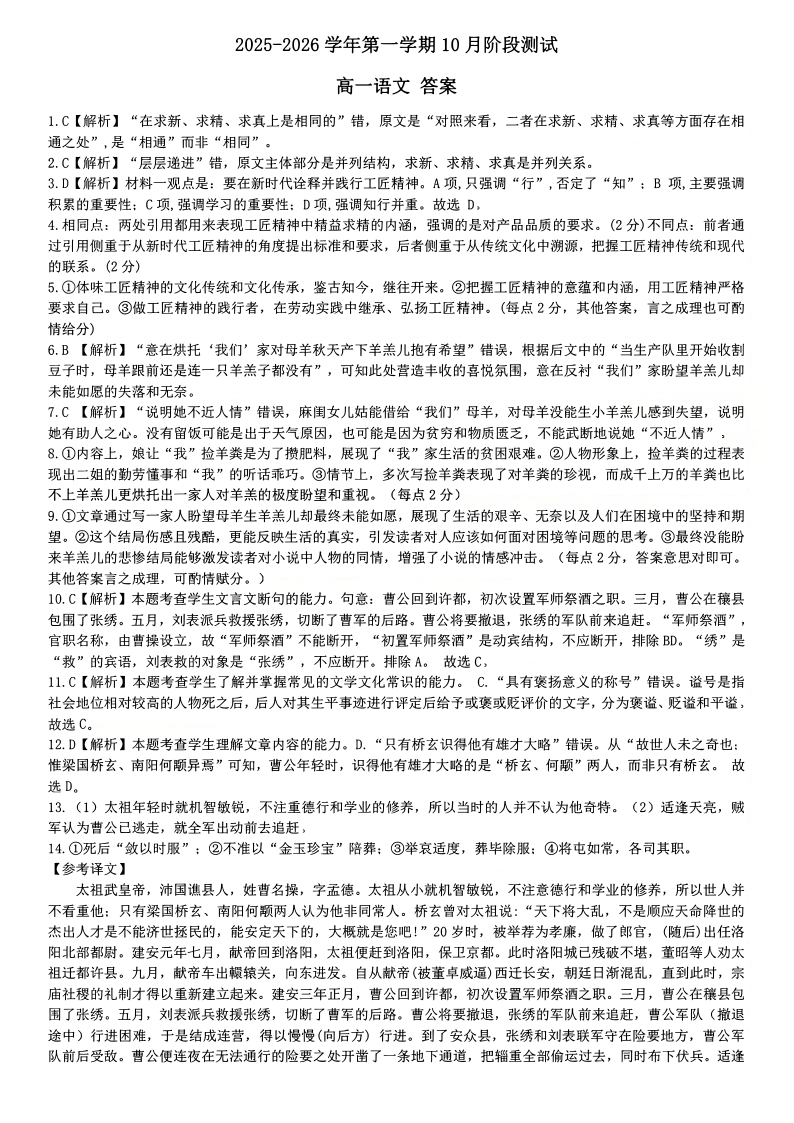 高一语文答案--山西省2025-2026学年高一第一学期10月阶段测试