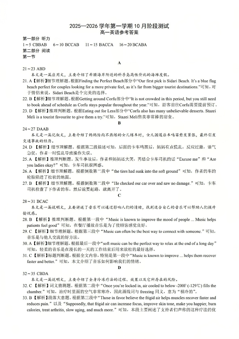高一英语答案--山西省2025-2026学年高一第一学期10月阶段测试
