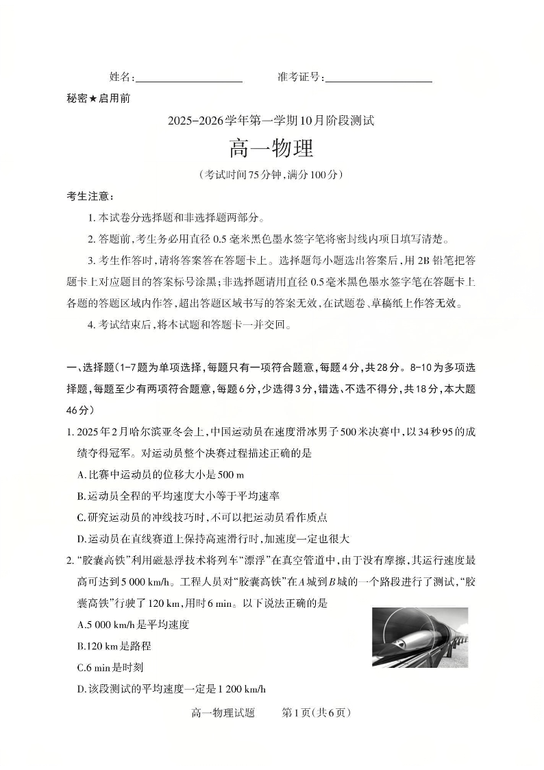 高一物理--山西省2025-2026学年高一第一学期10月阶段测试