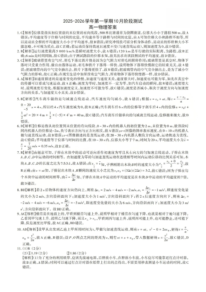 高一物理答案--山西省2025-2026学年高一第一学期10月阶段测试