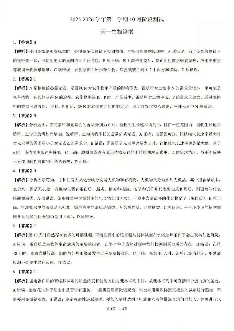 高一生物答案--山西省2025-2026学年高一第一学期10月阶段测试