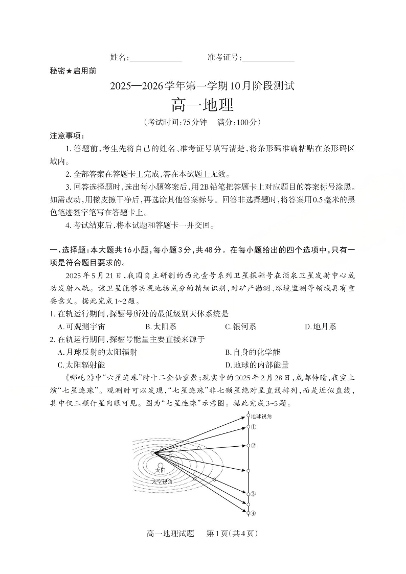 高一地理--山西省2025-2026学年高一第一学期10月阶段测试
