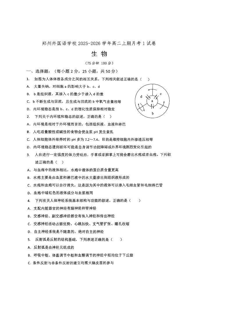 高二生物+答案--河南省郑州外国语学校2025-2026学年高二上学期10月月考试题