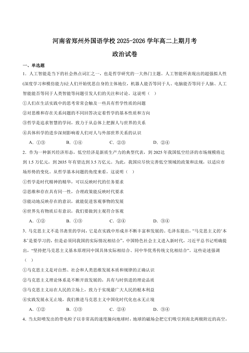 高二政治+答案--河南省郑州外国语学校2025-2026学年高二上学期10月月考试题